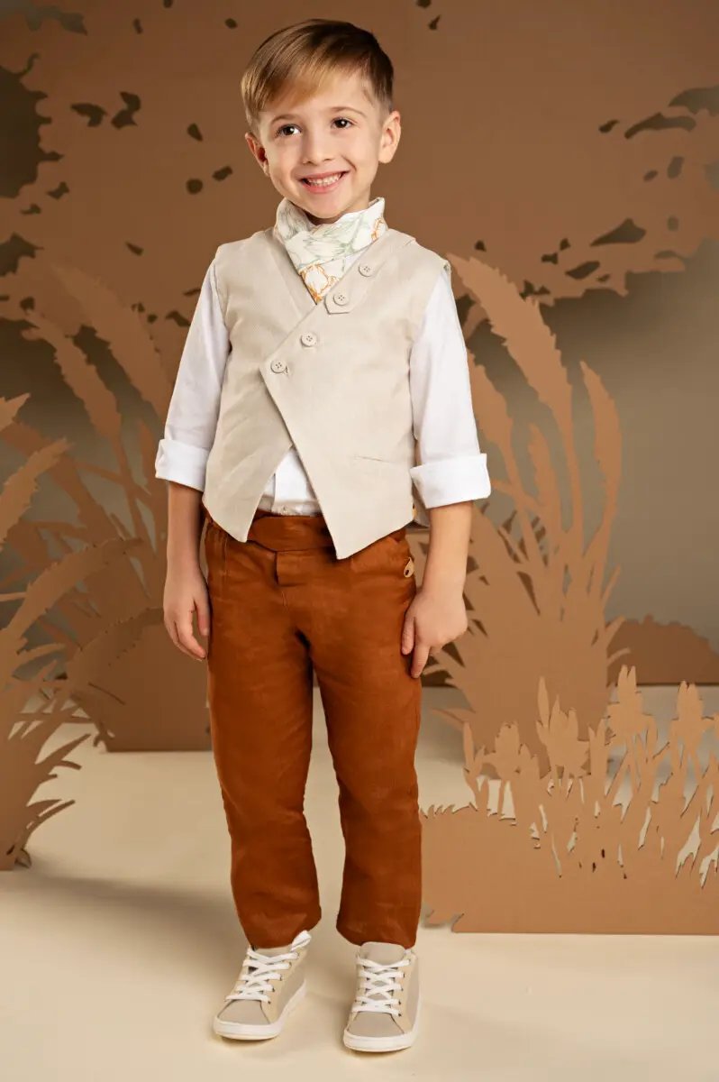 Μια πρόταση που ξεχωρίζει για τον όμορφο χρωματικό συνδυασμό και τις ιδιαίτερες λεπτομέρειες στον σχεδιασμό. Το παντελόνι από λινό ύφασμα σε απόχρωση σαφράν, δένει υπέροχα με το γιλέκο από μπεζ Tencel-cotton-linen ύφασμα με το λοξό κούμπωμα και τις ξεχωριστές λεπτομέρειες . Το λευκό βαμβακερό πουκάμισο με Mao γιακά και το φλοράλ φουλάρι σε αποχρώσεις μέντας και σαφράν με exclusive τύπωμα Baby Bloom ολοκληρώνει το look με στιλ. Για την τελευταία πινελιά, επιλέξτε ανάμεσα σε ψάθινο καπέλο ή υφασμάτινη τραγιάσκα, σύμφωνα με το προσωπικό σας στυλ.