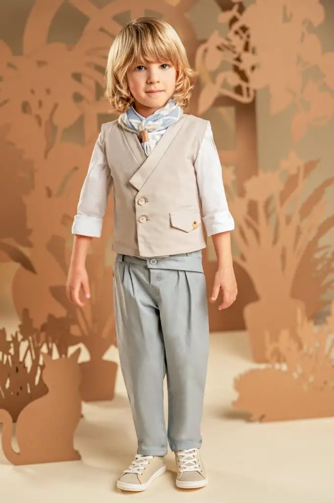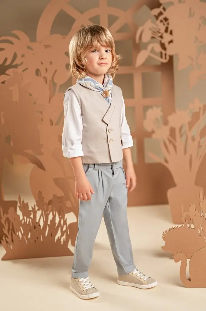 Ένα σύνολο που φέρνει νέα πνοή στη διαχρονική κομψότητα με απαλούς χρωματικούς συνδυασμούς και υπέροχο design.Το δίπιετο παντελόνι με την έξτρα λοξή ζώνη σε γκρι-σιελ απόχρωση από Tencel-viscose ύφασμα και το σταυρωτό γιλέκο με τον γιακά κιμονό σε μπεζ βαμβακερό ύφασμα δημιουργούν ένα εξαιρετικό σύνολο. Το λευκό βαμβακερό πουκάμισο και το φουλάρι με γεωμετρικά σχέδια σε σιελ αποχρώσεις με exclusive τύπωμα Baby Bloom ολοκληρώνουν μοναδικά το look. Για την τελική πινελιά, επιλέξτε ανάμεσα σε ψάθινο καπέλο ή υφασμάτινη τραγιάσκα, σύμφωνα με το προσωπικό σας στυλ