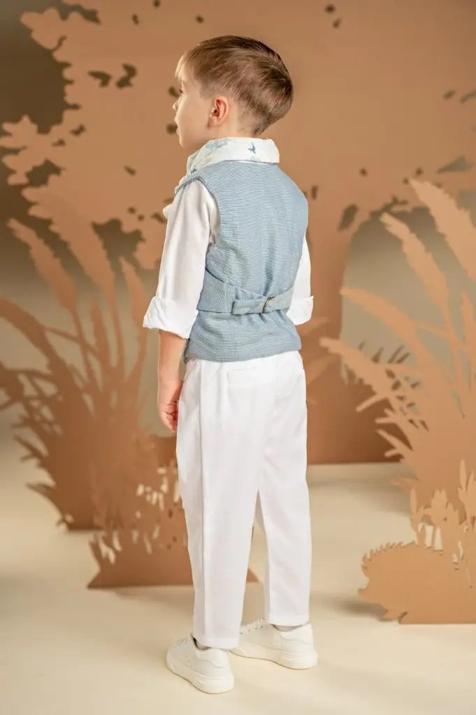 Για εμφάνιση που ξεχωρίζει, αυτό το αγορίστικο σύνολο εντυπωσιάζει με την αρμονία των χρωμάτων και το ιδιαίτερο στυλ του. Το σετ περιλαμβάνει λευκό παντελόνι από cotton-linen ύφασμα με ιδιαίτερες reverse πιέτες και συνδυάζεται με σταυρωτό γιλέκο σε σιελ μελανζέ βαμβακερό ύφασμα και off white βαμβακερό πουκάμισο. To look ολοκληρώνει το φουλάρι από βαμβακερό ύφασμα με μοναδικό baby bloom exclusive φλοράλ εμπριμέ σε σιελ αποχρώσεις, παπιγιόν και ανάλογα με το στιλ που προτιμάτε ψάθινο καπέλο ή υφασμάτινη τραγιάσκα.