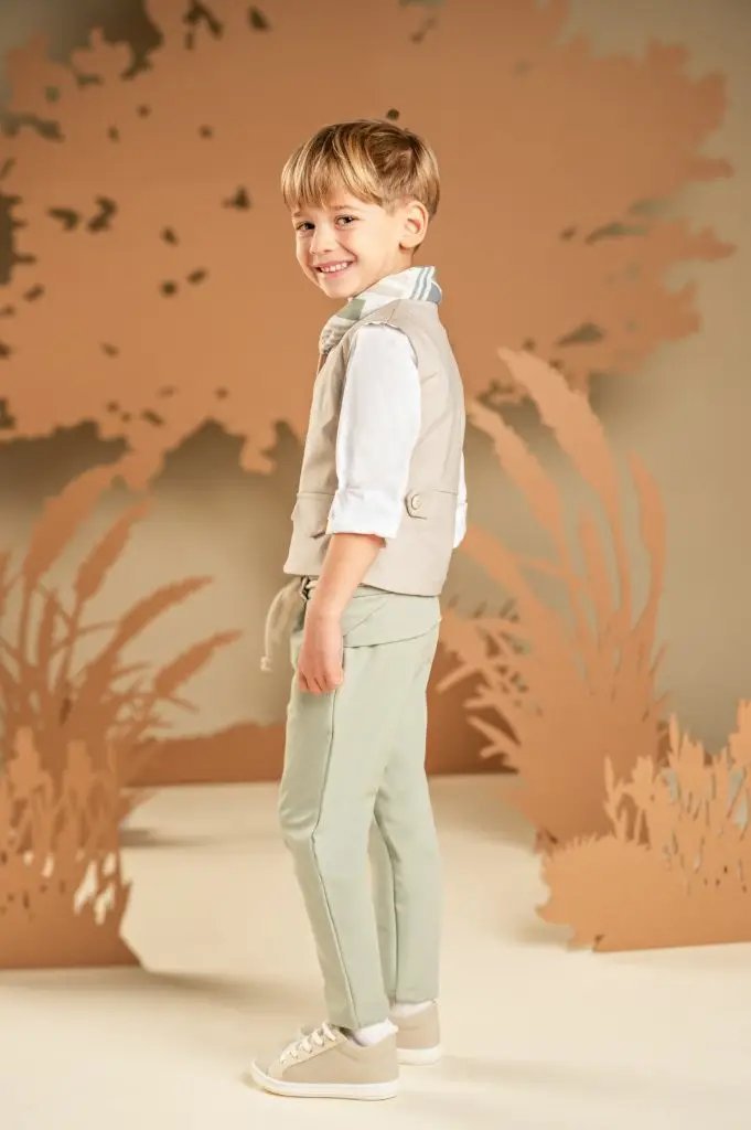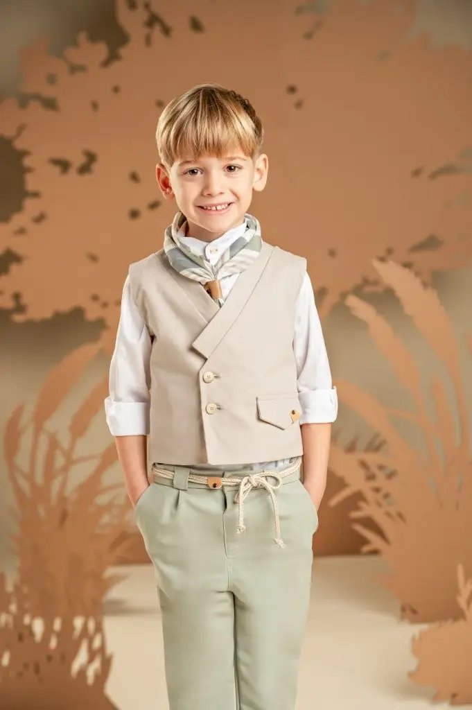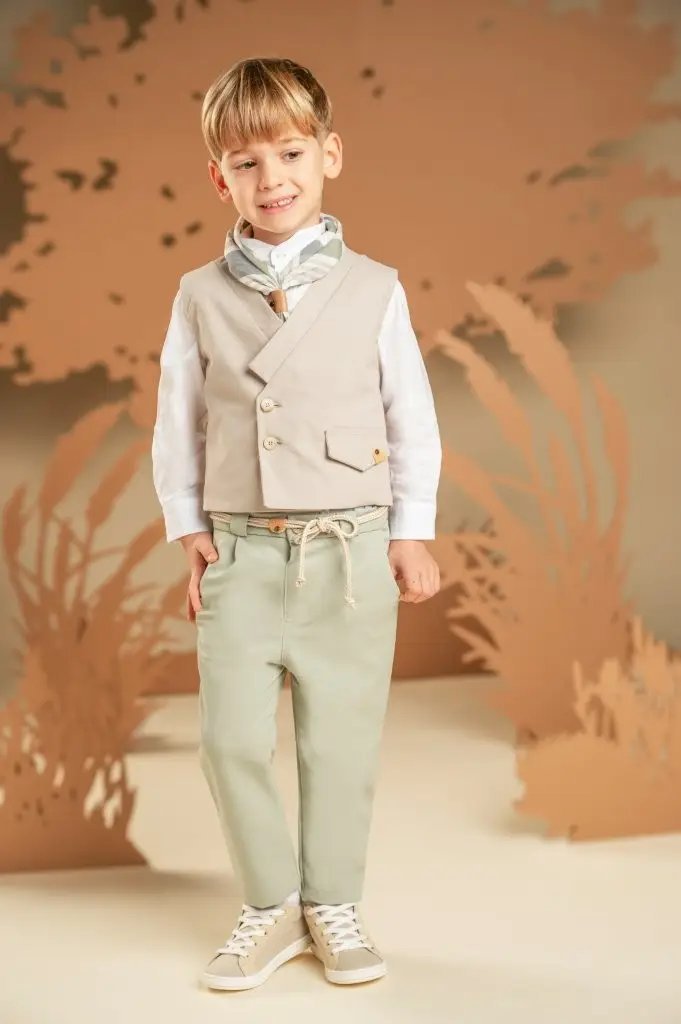 Για τους μικρούς κυρίους που αγαπούν τις προσεγμένες λεπτομέρειες και το σύγχρονο στυλ, αυτό το σετ είναι η ιδανική επιλογή. Το παντελόνι εντυπωσιάζει με το ιδιαίτερο σχέδιό του, φτιαγμένο από τεχνικό ύφασμα σε αποχρώσεις της salvia, ενώ το σταυρωτό γιλέκο με γιακά κιμονό σε μπεζ χρώμα από diagonal καμπαρντίνα προσθέτει κομψότητα στο σύνολο. Το λευκό βαμβακερό πουκάμισο και το φουλάρι με τα γεωμετρικά σχέδια σε λαδί αποχρώσεις με exclusive τύπωμα Baby Bloom ολοκληρώνουν μοναδικά το look. Για την τελική πινελιά, επιλέξτε ανάμεσα σε ψάθινο καπέλο ή υφασμάτινη τραγιάσκα, σύμφωνα με το προσωπικό σας στυλ.