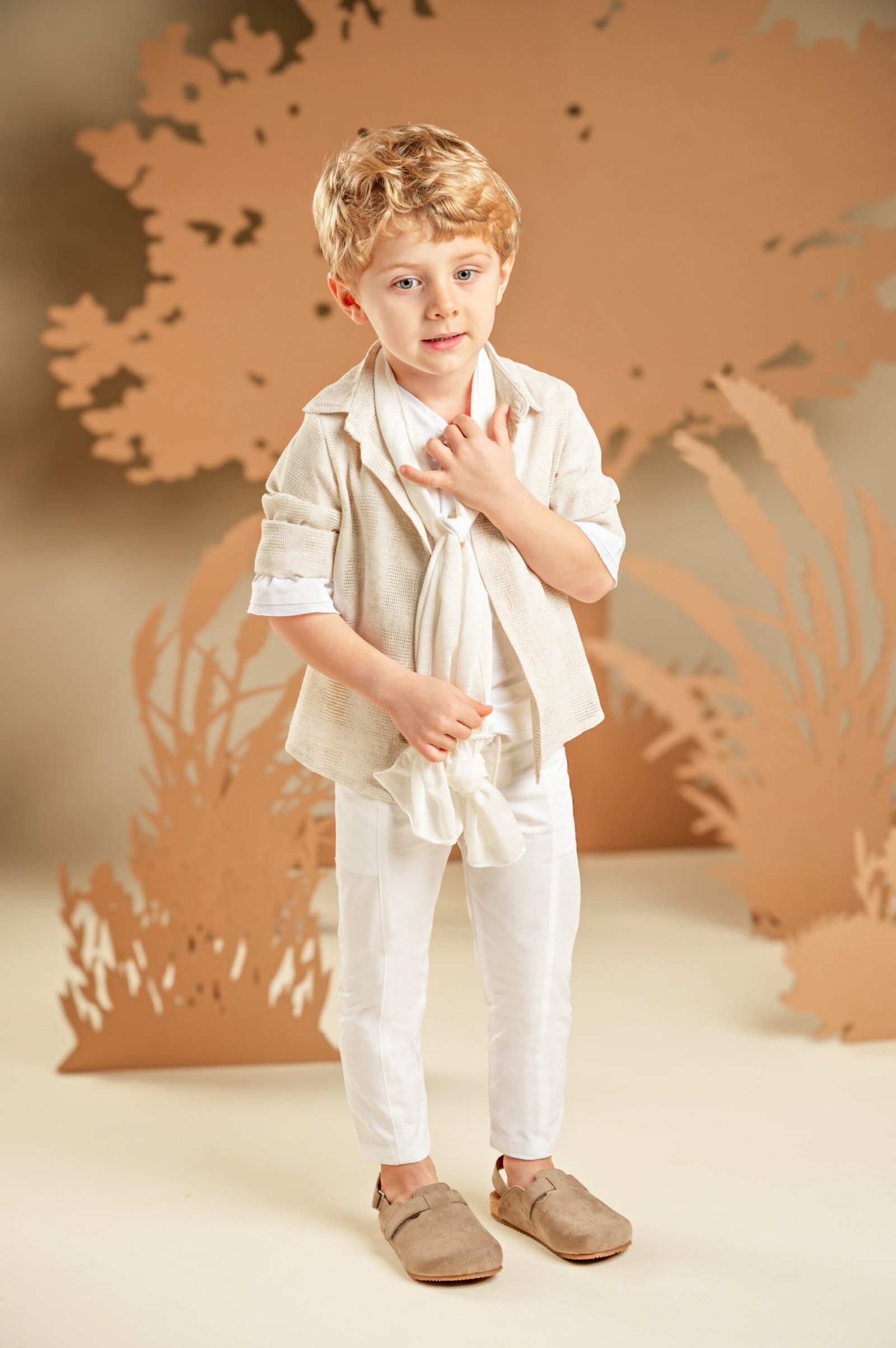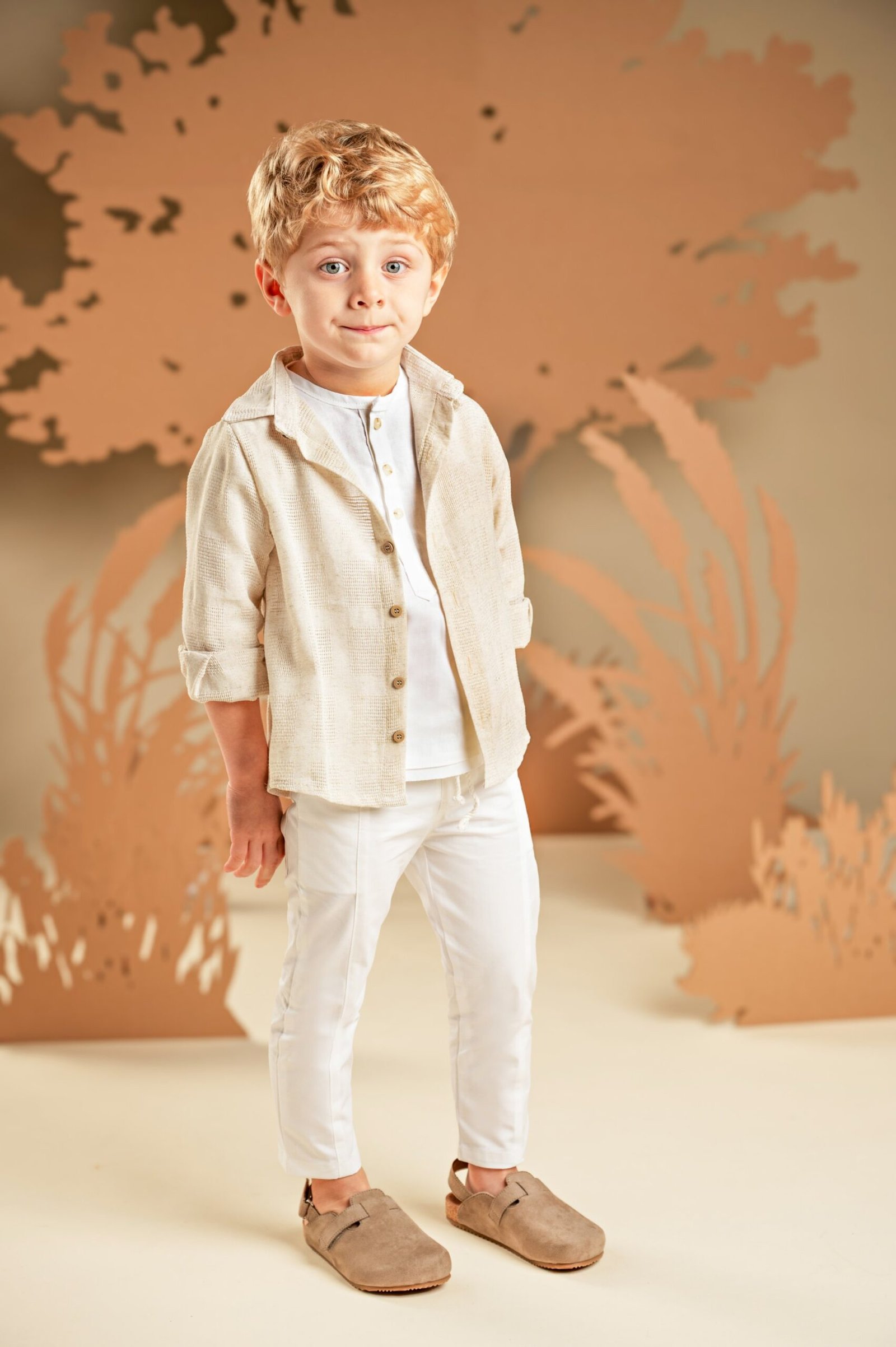 Ένα σύνολο με χαλαρή και σύγχρονη αισθητική, ιδανικό για όσους αγαπούν τις ξεχωριστές εμφανίσεις. Το σετ αποτελείται από παντελόνι σε λευκή καμπαρντίνα με εντυπωσιακά κοψίματα μπροστά και πίσω, συνδυασμένο με 100% λινή λευκή τουνίκ με πατιλέτα για άνεση και δροσιά. Το πουκάμισο από μπεζ υφαντό ύφασμα φοριέται από πάνω, ολοκληρώνοντας το layered look. Για την τελική πινελιά, επιλέξτε ανάμεσα σε ψάθινο καπέλο ή υφασμάτινη τραγιάσκα, ανάλογα με το προσωπικό σας στυλ.